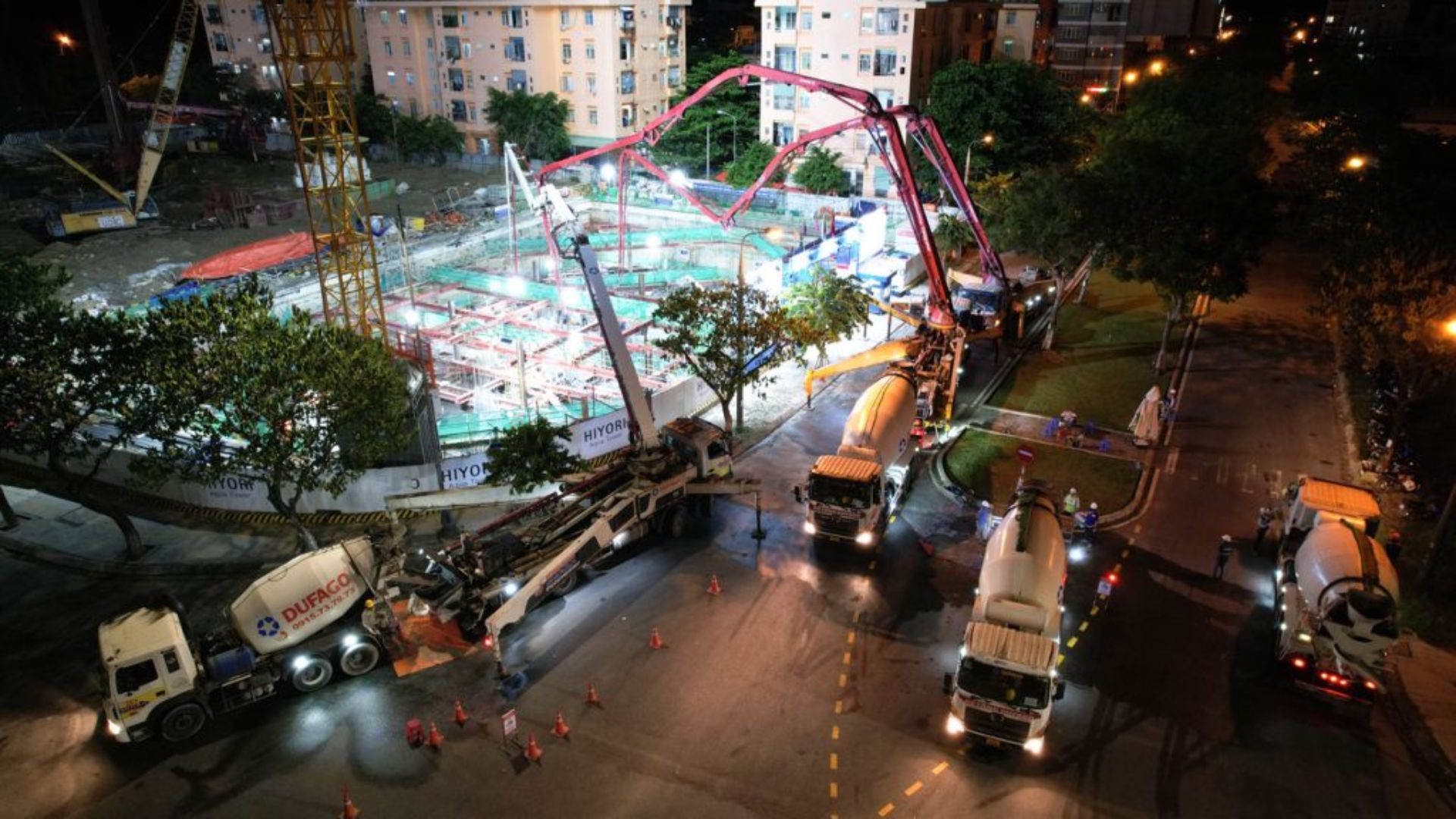 - Đóng nắp tầng hầm, bắt đầu phần thân (10/2025): Ngày 4/10/2025, dự án đạt cột mốc đổ bê tông sàn tầng trệt (tầng 1) và đóng nắp tầng hầm thành công. Sự kiện này đánh dấu việc công trình chuyển từ giai đoạn thi công ngầm sang thi công thân trên mặt đất. Khối lượng bê tông đổ cho sàn tầng trệt hơn 500 m³ đã được cung ứng kịp thời để đảm bảo tiến độ lên tầng. Kể từ thời điểm này, Hiyori Aqua Tower mọc lên rõ nét từng ngày với cấu trúc các tầng nổi.